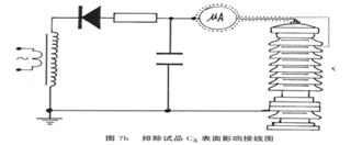 微安表必須有金屬屏蔽,應(yīng)采用屏蔽線與試品聯(lián)接。高壓引線的屏蔽引出應(yīng)與儀表端的屏蔽緊密聯(lián)接。如果試品表面污穢要排除試品表面泄漏電流的影響可在試品高電位端用裸金屬軟線緊密繞幾圈后與高壓引線的屏蔽相聯(lián)接(見下圖)。